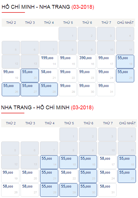 Bảng giá vé chặng bay HCM-NhaTrang tháng 3.
