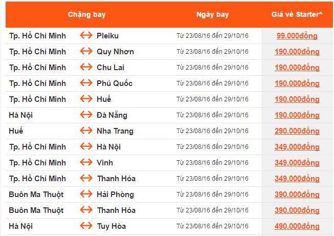 Giá vé một chiều, chưa bao gồm thuế, phí. Giá vé phụ thuộc tình trạng chỗ của chuyến bay và chỉ mở bán cho một số chuyến bay và ngày bay. Vé không được hoàn, hạn chế thay đổi, nếu thay đổi phải đóng phí. Không bao gồm Hành lý ký gửi. Các tiêu chuẩn về trọng lượng và kích thước của Hành lý xách tay sẽ được áp dụng. Hành khách mang Hành lý xách tay không đúng với quy định sẽ phải làm thủ tục ký gửi và phải đóng phí.