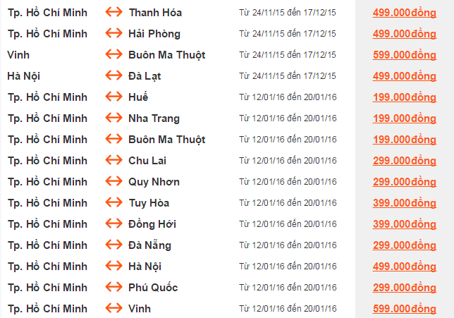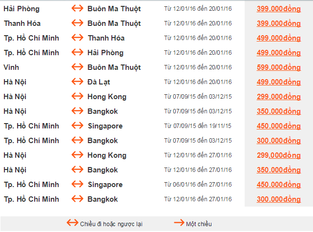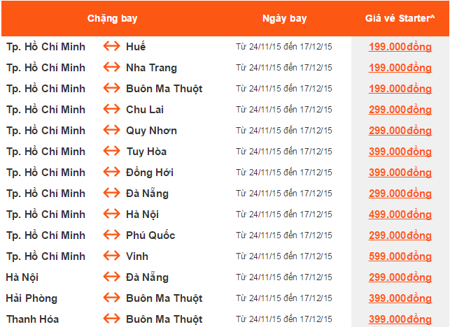 Giá vé một chiều, chưa  bao gồm thuế, phí. Giá vé phụ thuộc tình trạng chỗ của chuyến bay và chỉ mở bán  cho một số chuyến bay và ngày bay. Vé không được hoàn, hạn chế thay đổi, nếu thay đổi phải đóng phí.  ^Không bao gồm Hành lý ký gửi. Các tiêu chuẩn về trọng lượng và kích thước của Hành lý xách tay sẽ được áp dụng. Hành khách mang Hành lý xách tay không đúng với quy định sẽ phải làm thủ tục ký gửi và phải đóng phí.