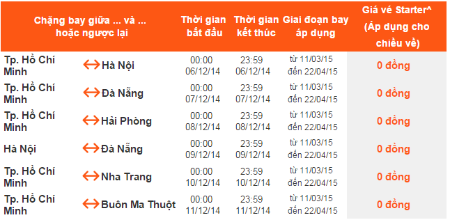 Lưu ý: Để mua được vé khuyến mại 0 đồng, Quý khách phải lựa chọn hành trình bay khứ hồi trong giai đoạn có khuyến mại. Khi đó giá mở bán cho chiều đi là giá bình thường trên hệ thống, giá mở bán cho chiều về được khuyến mại chỉ 0 đồng.