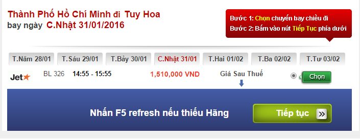 Ở thời điểm hiện tại, vé máy bay Tết trên hành trình Tp Hồ Chí Minh – Tuy Hòa đã HẾT VÉ trong các ngày bay cận Tết từ ngày 02/02/2016 – 09/02/2016 (tức từ ngày 28/12 đến ngày 02/01 âm lịch).