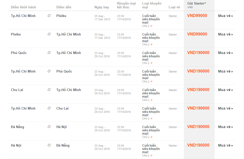 Giá vé một chiều, chưa bao gồm thuế, phí. Giá vé phụ thuộc tình trạng chỗ của chuyến bay và chỉ mở bán cho một số chuyến bay và ngày bay. Vé không được hoàn, hạn chế thay đổi, nếu thay đổi phải đóng phí. Không bao gồm Hành lý ký gửi. Các tiêu chuẩn về trọng lượng và kích thước của Hành lý xách tay sẽ được áp dụng. Hành khách mang Hành lý xách tay không đúng với quy định sẽ phải làm thủ tục ký gửi và phải đóng phí.