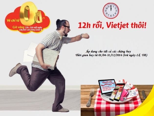 Theo đó, loạt vé máy  bay 0 ĐỒNG được Vietjet mở bán từ ngày 28/03/2016 đến 03/04/2016.